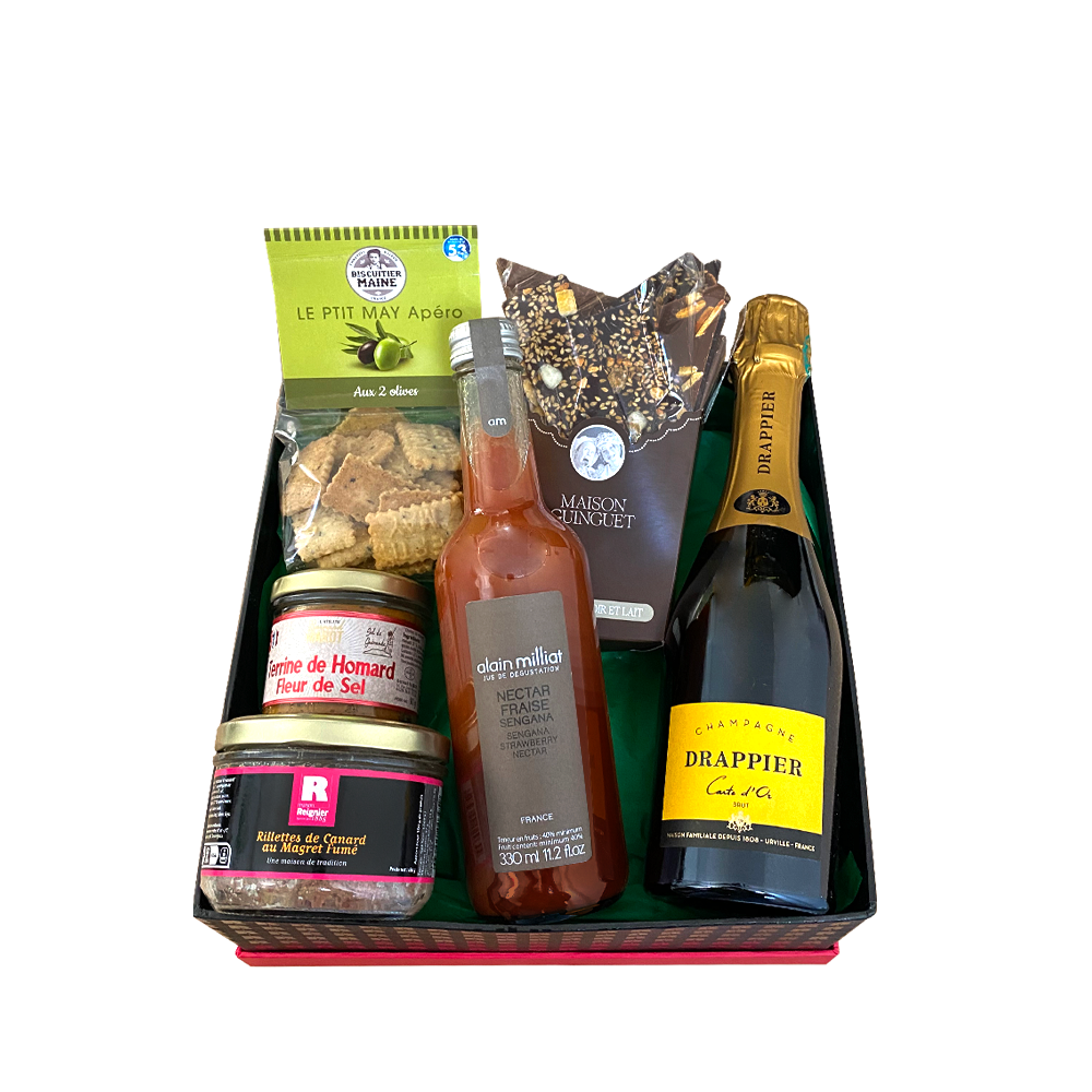 Pétillante et gourmande. Voilà une corbeille garnie tout à fait appétissante ! Avec ses bulles et ses excellents produits du terroir, la box célébration est le cadeau idéal à offrir à un client ou à un collaborateur pour le remercier du travail effectué ensemble.